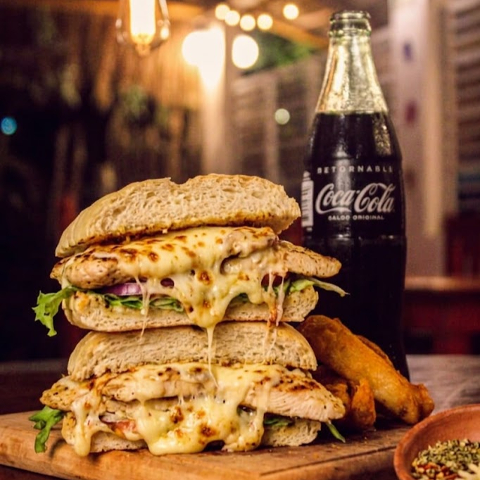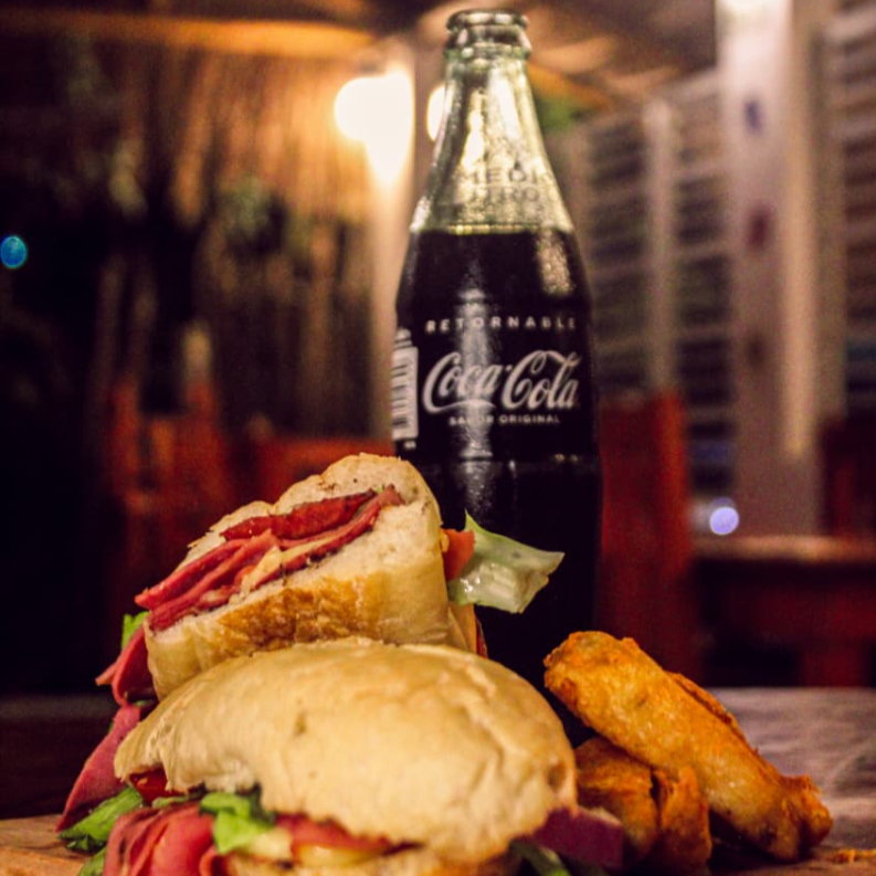 Jamon, salami, queso, lechuga, tomate, cebolla, porcion de papas y una coca de 400Ml