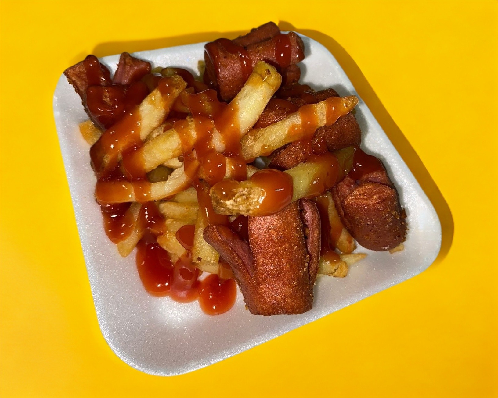 Salchicha jumbo, tocino, piña, queso Oaxaca, aderezo, catsup, cebolla..