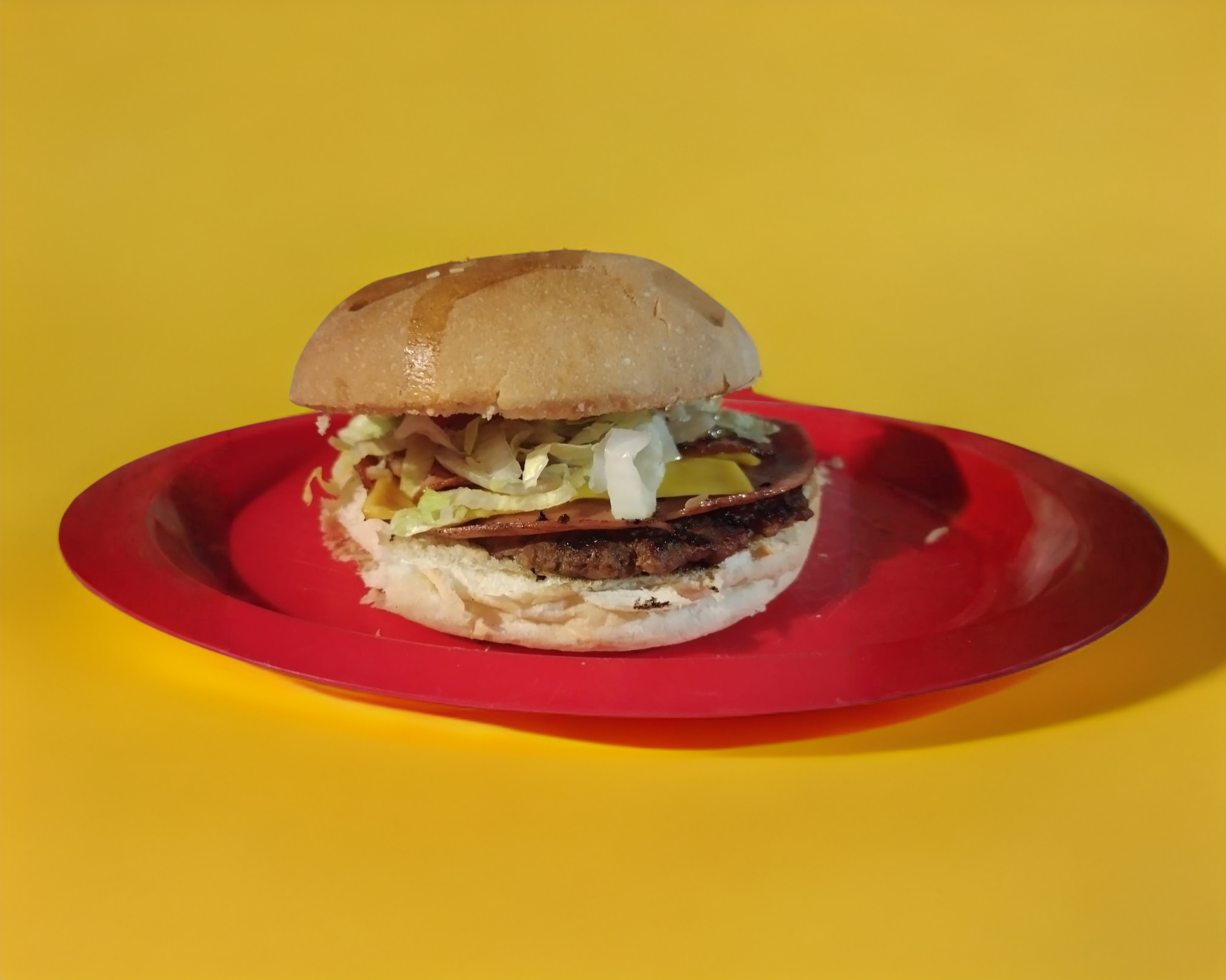 Carne, jamón, queso, aderezo, catsup, lechuga, tomate, cebolla.