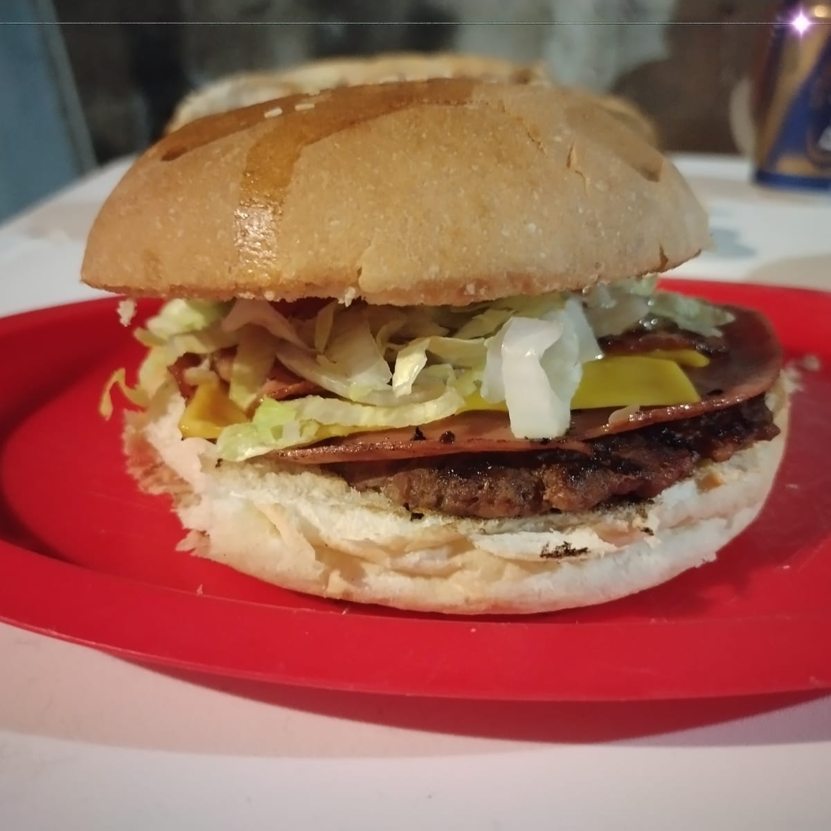 2 carnes, tocino, jamón, queso, catsup, lechuga, tomate.