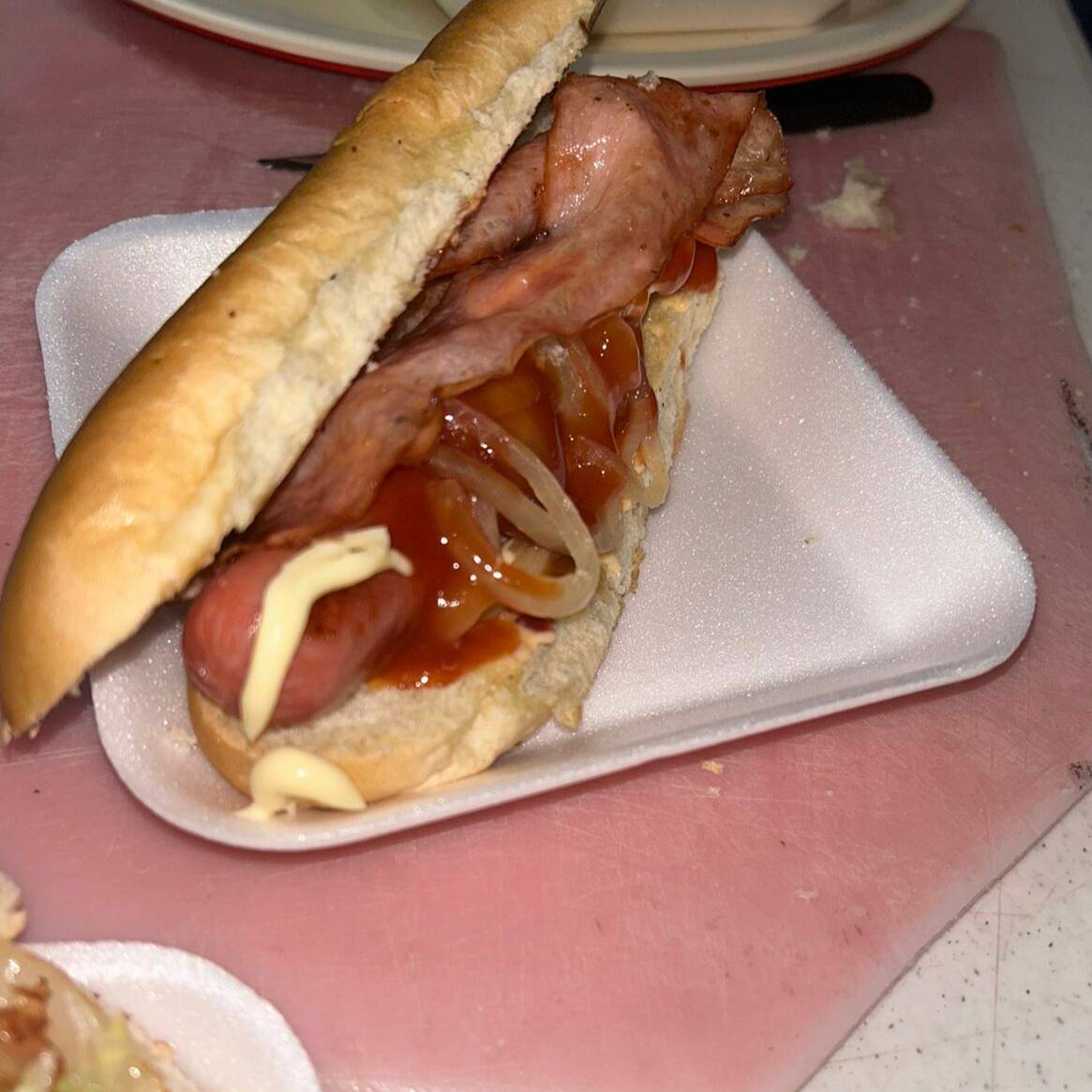Salchicha jumbo, tocino, aderezo, catsup, cebolla