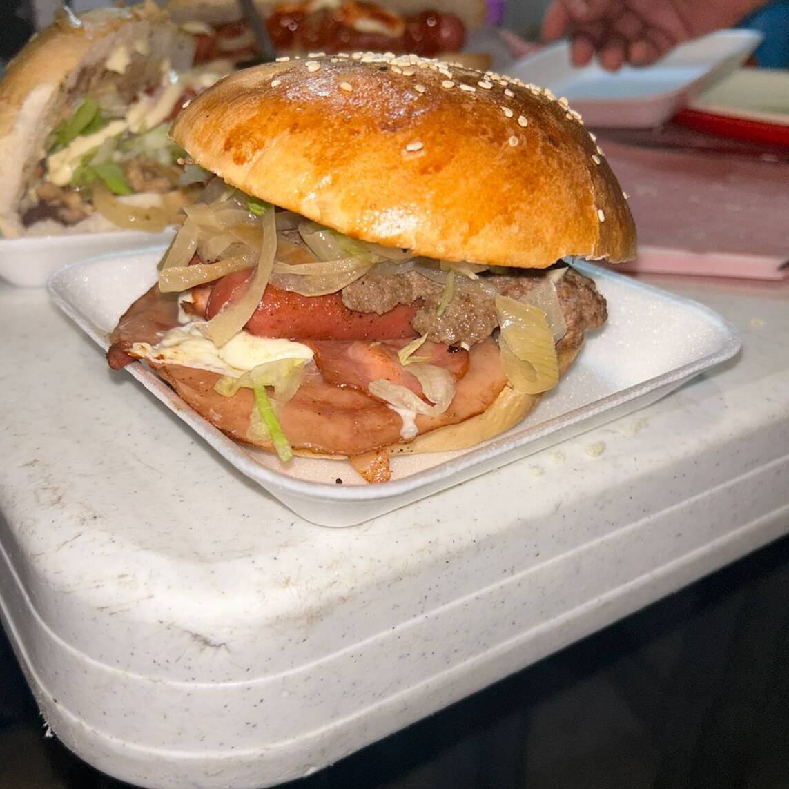 Carne de res, tocino, salchicha, jamón, queso, catsup, lechuga, tomate, cebolla