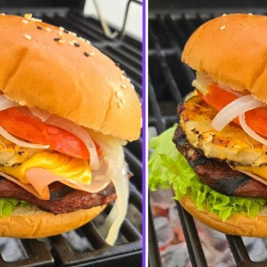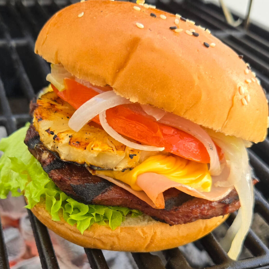 carne de res, tocino ahumado, jamón, queso americano, piña, cebolla caramelizada, vegetales y aderezos.