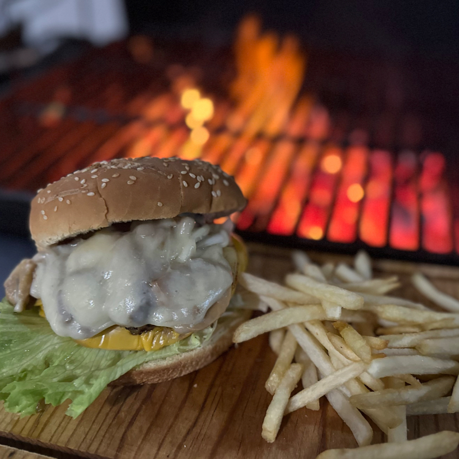 carne de res, queso fundido con champiñones y especias, jamón, queso americano, piña, cebolla caramelizada, vegetales y aderezos.