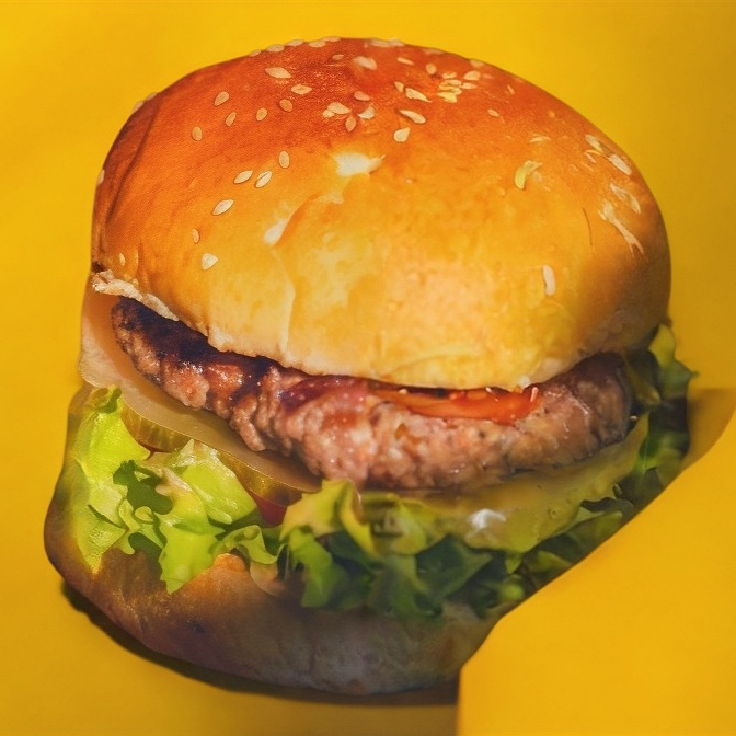 120gr de carne, queso amarillo, lechuga, tomate y cebolla, pan preparado en Casa. Acompañada de papas a la francesa