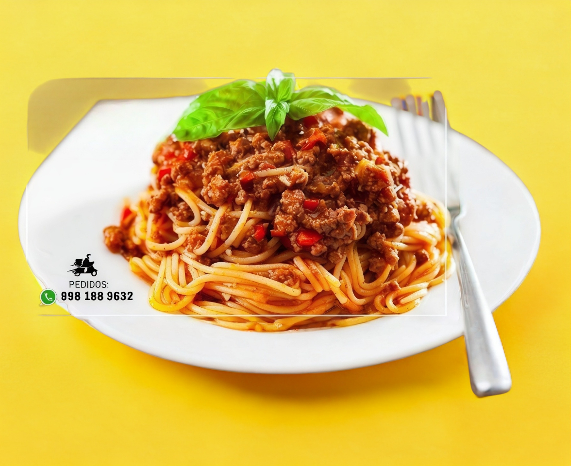 Salsa roja con carne de res, vegetales mixtos en pequeños trozos, terminada con queso parmesano y un toque de pesto.