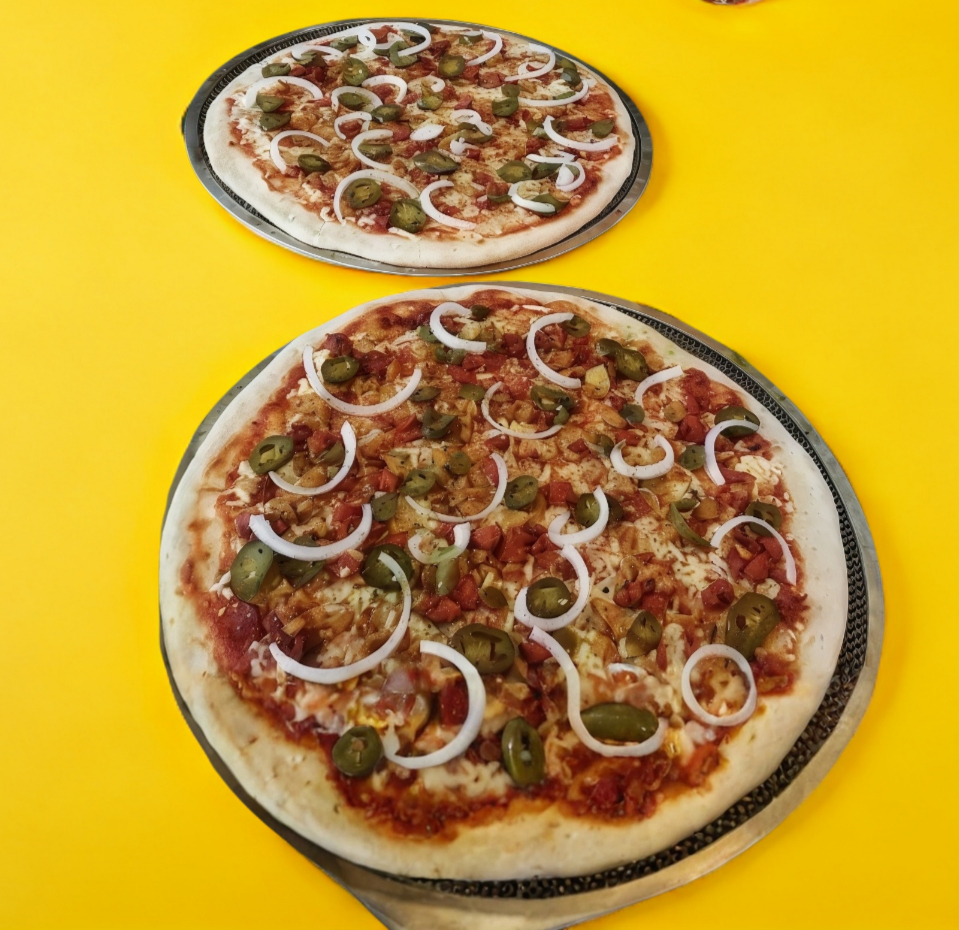 Dos Pizza Clásica mediana de un solo ingrediente a elegir: peperoni, Jamón, chorizo, aceitunas negras, Pimientos, piña, champiñones