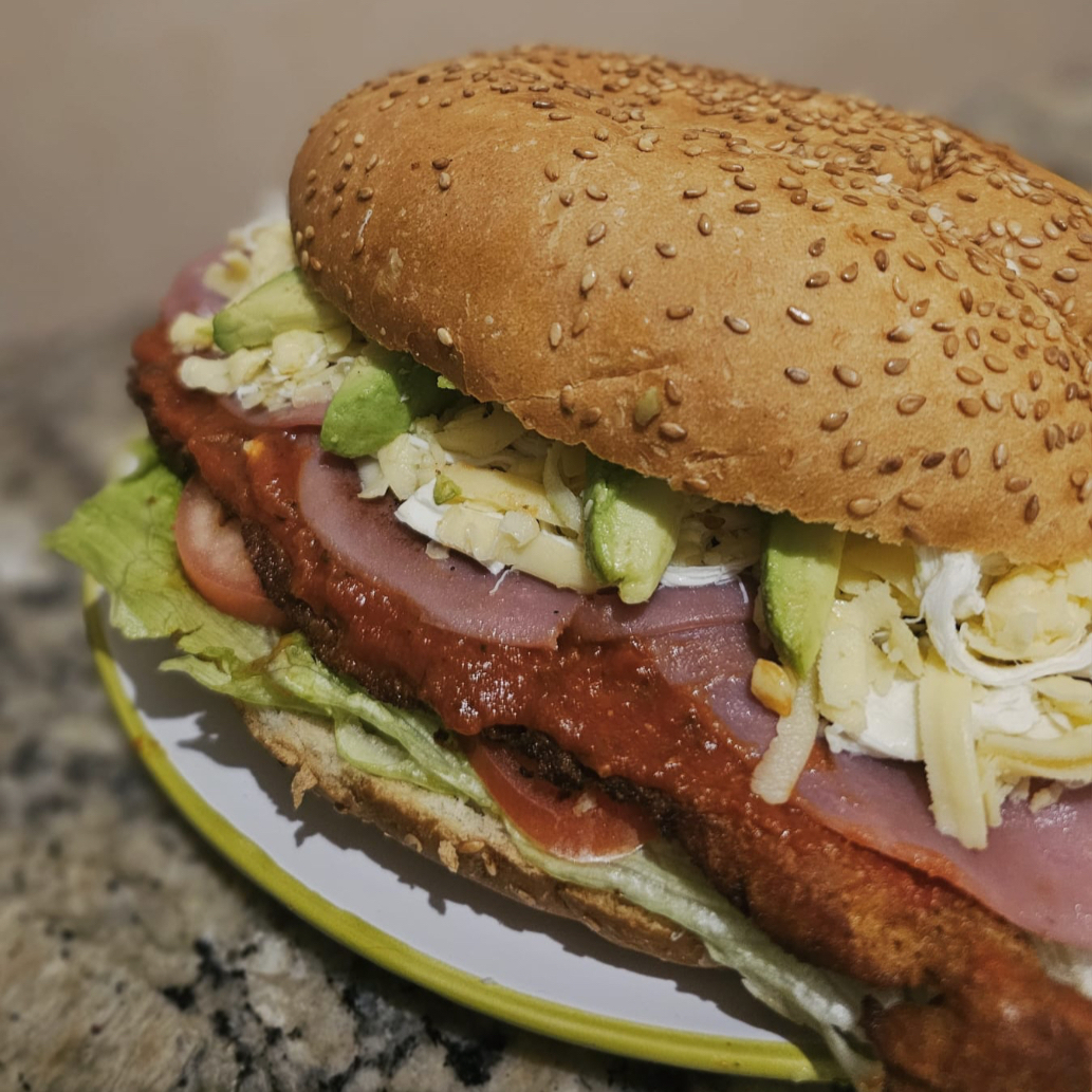 Milanesa, Salsa Casse, jamón, mezcla de quesos, mayonesa, frijol y verduras.