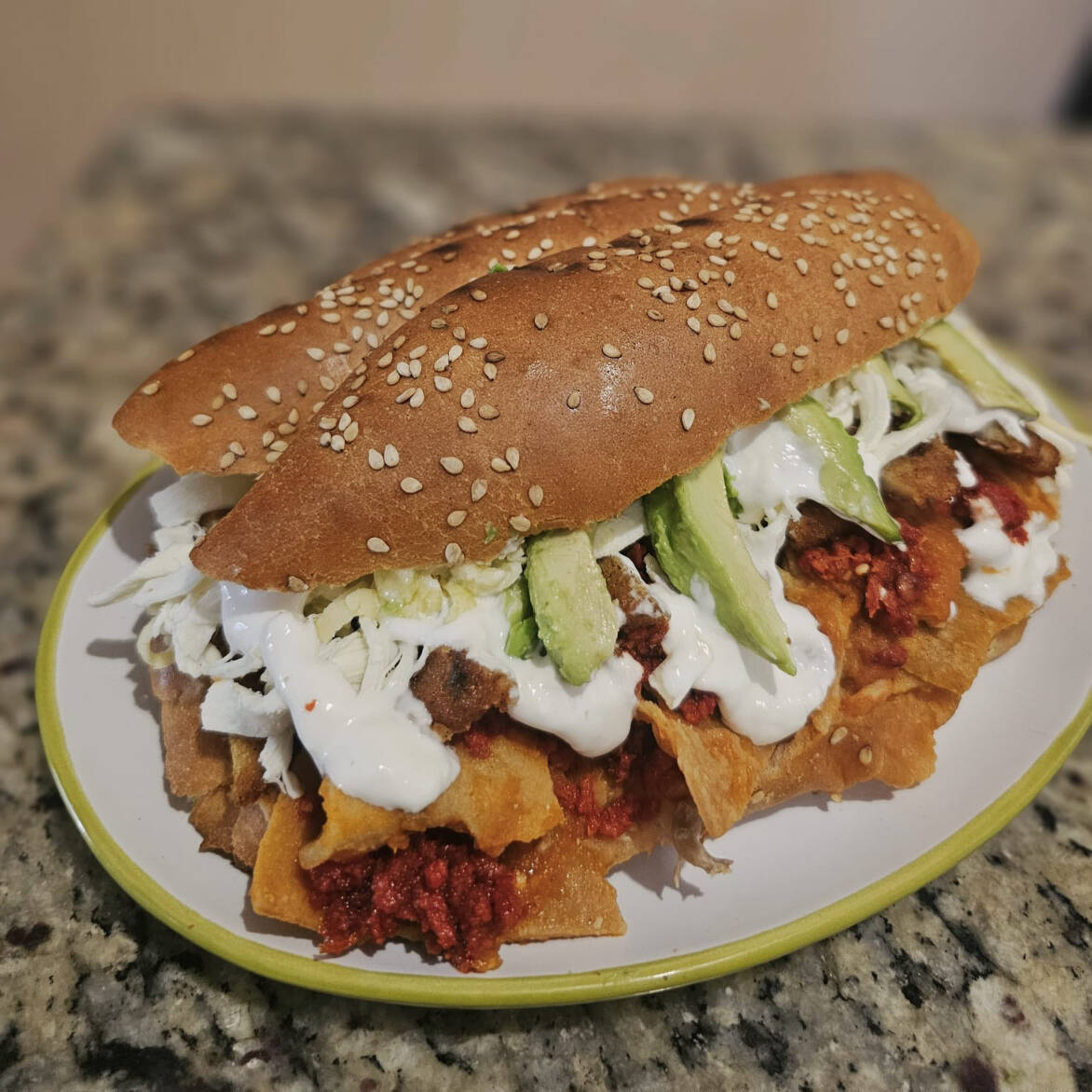 Chilaquiles con chorizo, milanesa, crema, mezcla de quesos, aguacate y cebolla