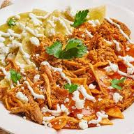 Crujiste tortilla frita bañada en una deliciosa salsa roja servido con queso, crema, cebolla y pollo (no pica)