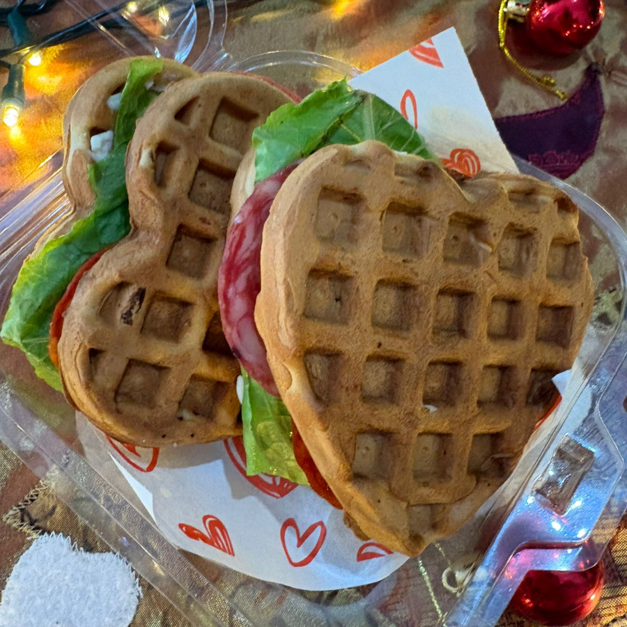 2 Sándwiches de waffle rellenos de carnes frías, queso crema y lechuga.