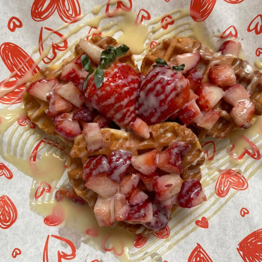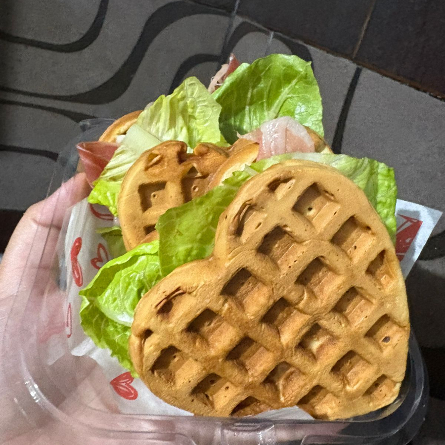 2 Sándwiches de waffle rellenos de jamón serrano, queso crema y lechuga.