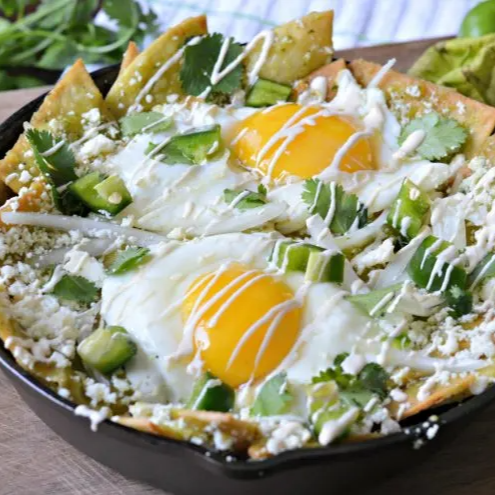 Crujisten tortilla frita bañada en una deliciosa y picosita salsa verde servidos con queso, cebolla y crema y huevos