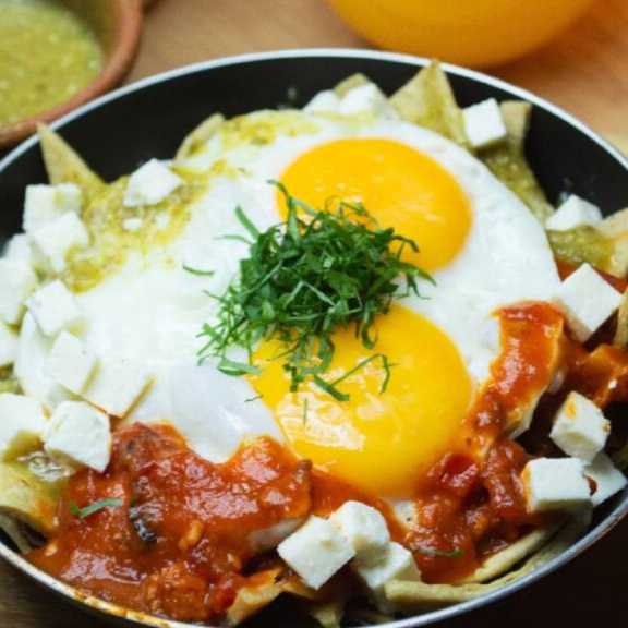Crujisten tortilla frita bañada en una deliciosa y picosita salsa verde y roja de tomate servidos con queso, cebolla , crema y huevo
