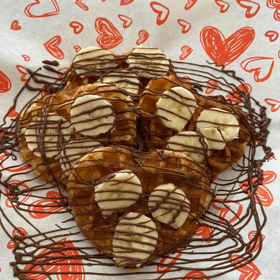 3 pzas De waffle cubiertas con chocoavellana y plátano.