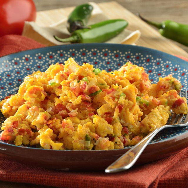 Huevos con jitomate, cebolla y chile serrano acompañado de un waffle con mantequilla