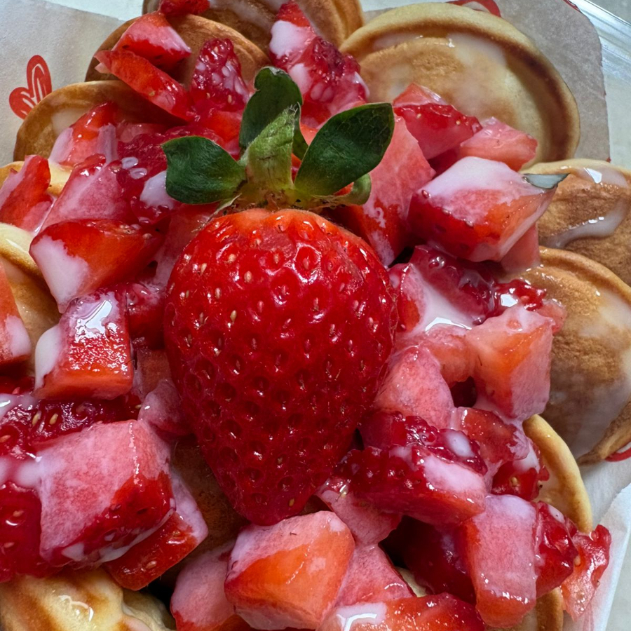 18 pzas De deliciosos mini hotcakes cubiertas de lechera y fresa.