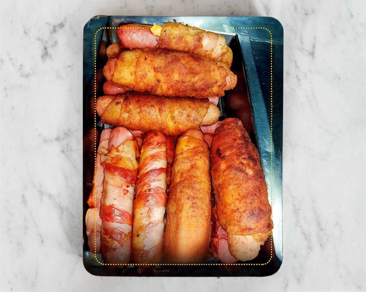 Salchicha de pavo, queso americano, jamón envuelto con tocino.