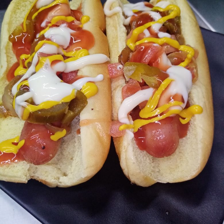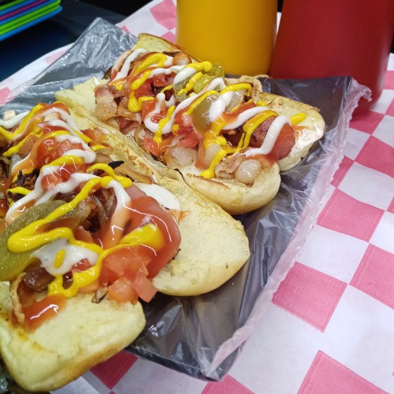 Salchicha de pavo, jitomate, cebolla asada, rajas, catsup, mayonesa y mostaza, jamón, queso americano, tocino.