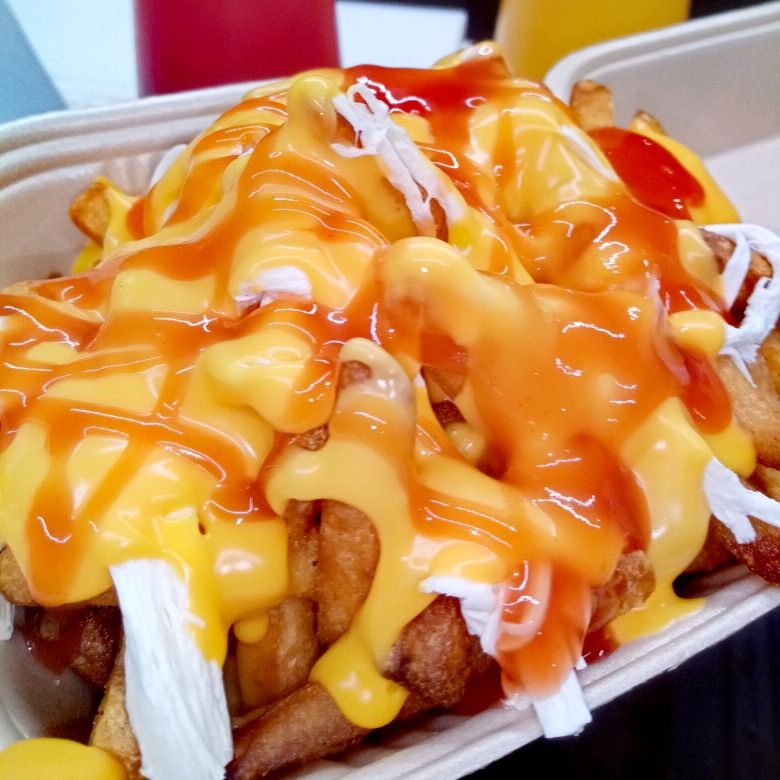 (Aprox.300 gramos porcion Personal )Orden de papa a la francesa acompañadas de queso oaxaca, queso amarillo derretido y catsup.