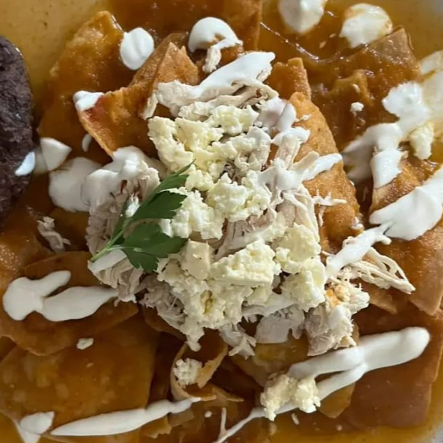 Chilaquiles verdes con pollo, crema, queso y frijoles