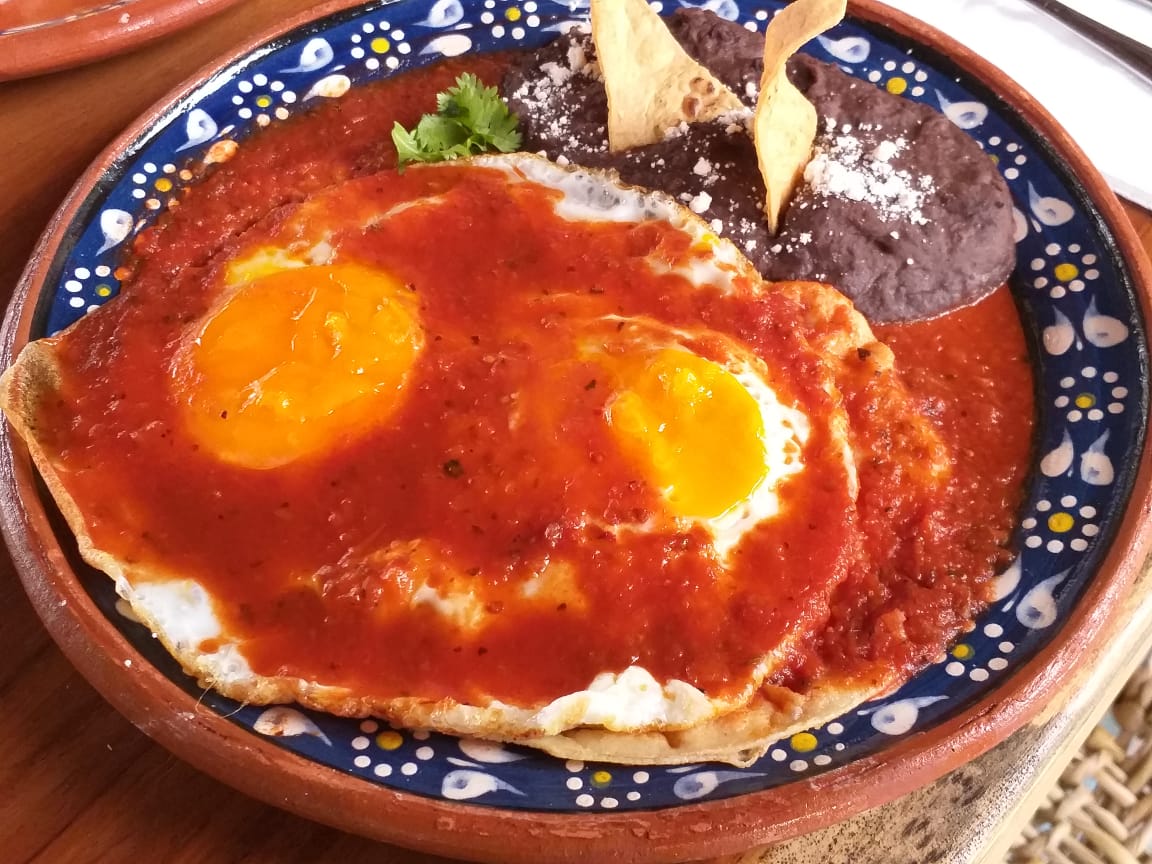 3 huevos fritos sobre tortillas de maiz pochadas, bañados en salsa ranchera acompañados de frijoles refritos