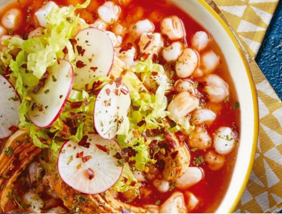 Delicioso Pozole de puerco, Acompañado de totopos, lechuga, rabanitos, chile piquin y oregano