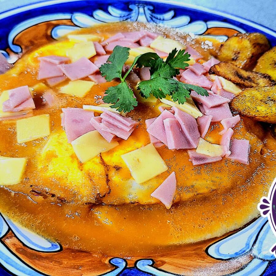 3 huevos fritos sobre tortilla de maiz con una embarradita de frijoles, con jamon y queso picados, bañaditos en salsa motul y acompañados de sus platanitos fritos