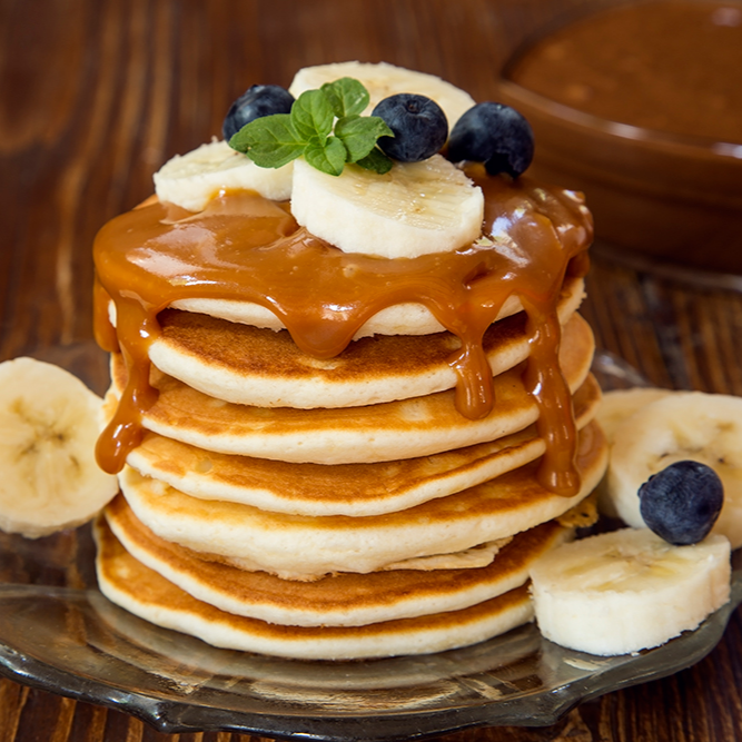servidos con cajeta, lechera, platano y frambuesas