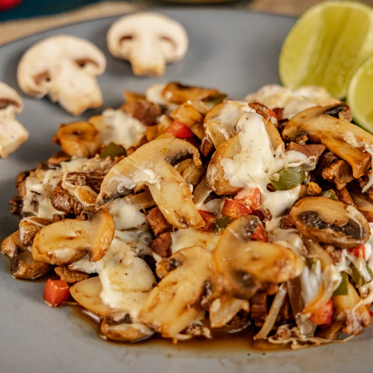 champiñones, chile poblano, cebolla fileteada y queso, acompañado de tortillas, limones y salsa