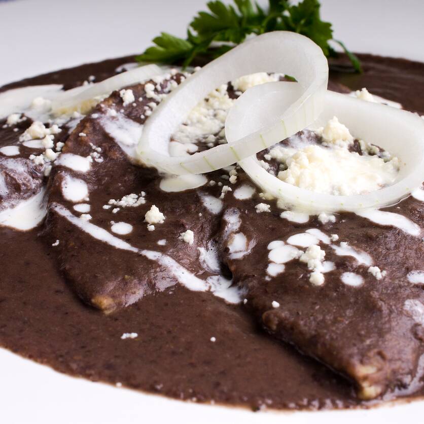 (6 pzs) rellenas de pollo deshebrado, bañadas en salsa de frijol perfumada de chipotle cubiertas con crema y queso