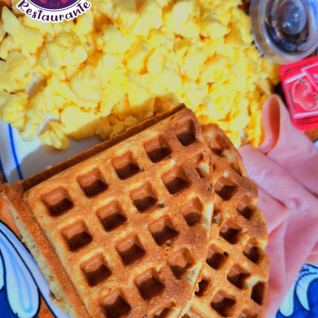 3 huevos revueltos, 4 wafles y 3 rebanadas de jamon acompañado de miel maple y salsa
