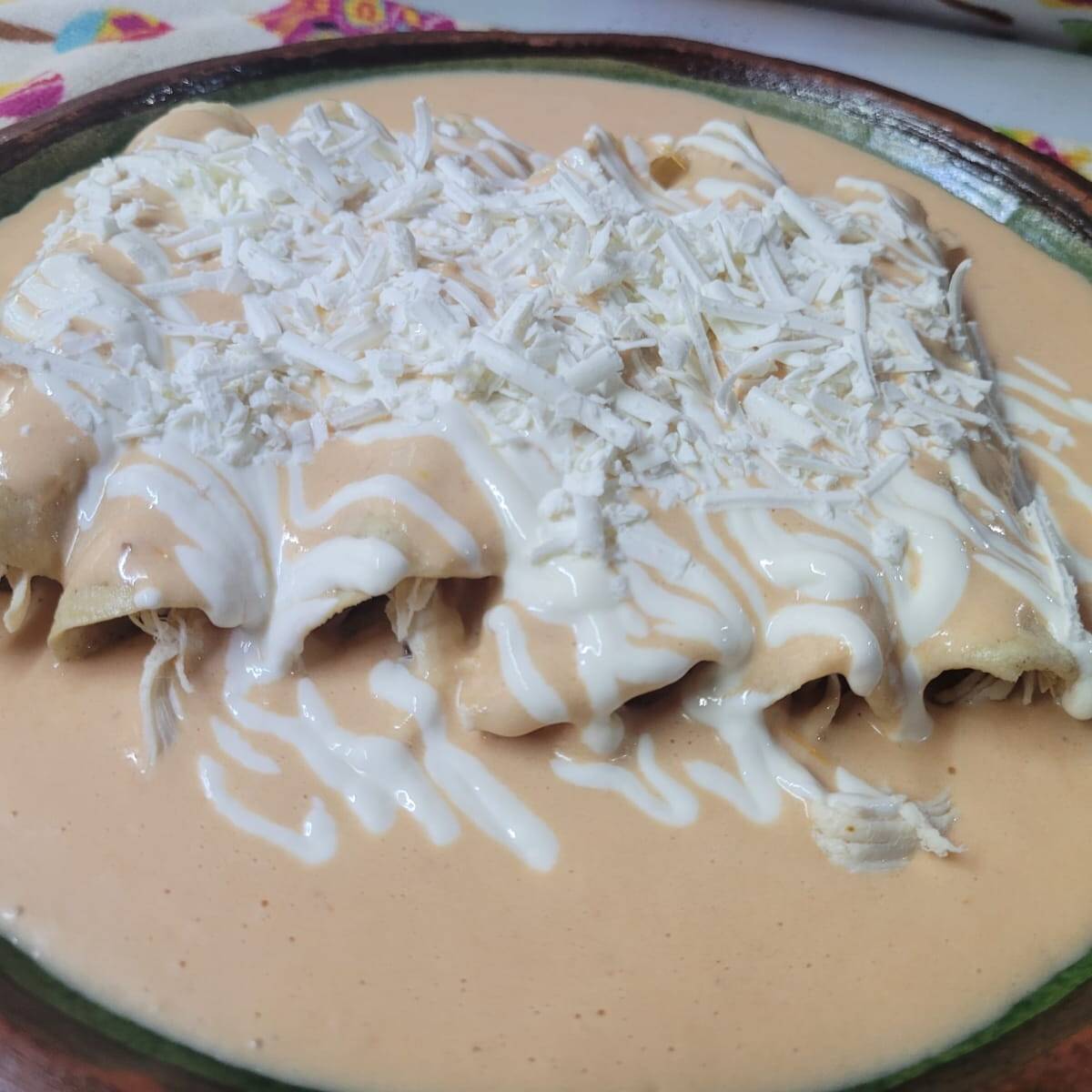 6 piezas de enchiladas rellenas de pollo deshebrado con nuestra salsa secreta a base de salsa ranchera, crema y queso, con queso fresco y crema