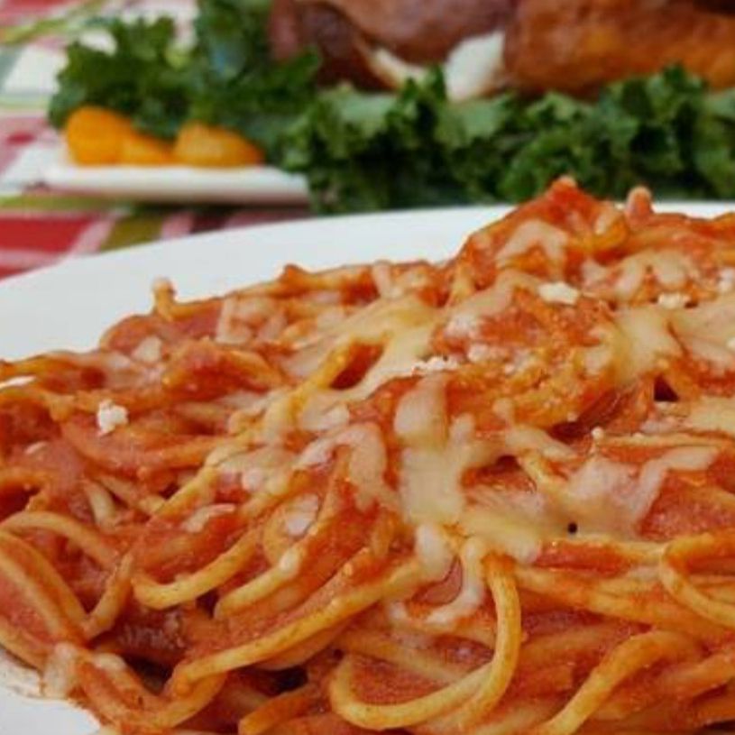Spaguetti con pure de tomate, jamón, queso parmesano y la proteina de tu eleccion