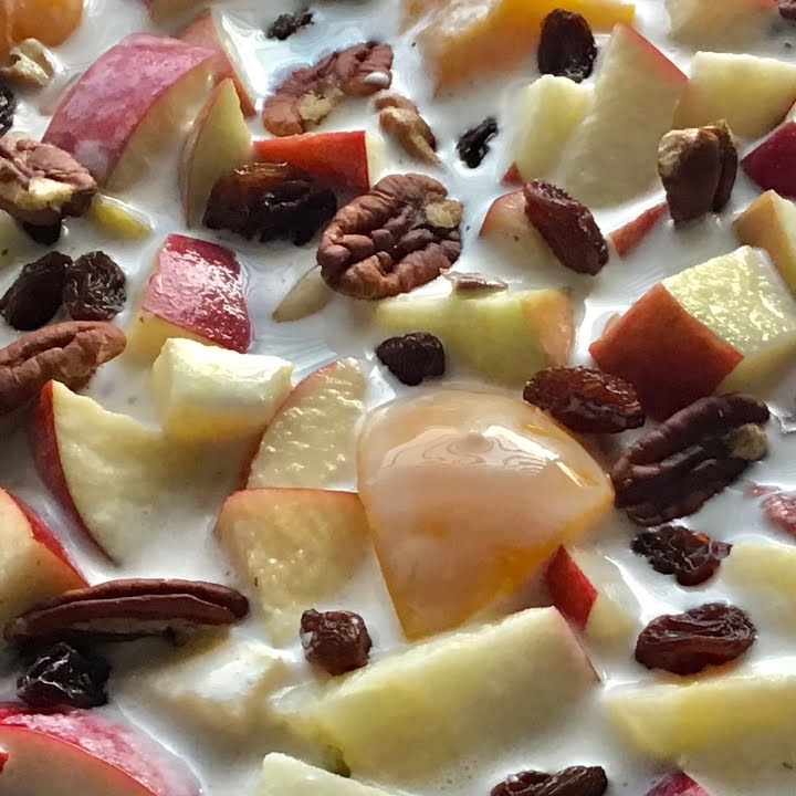 postre de la casa con duraznos en almibar, manzana, platano y nuez cubiertos con una crema dulce receta secreta de la casa