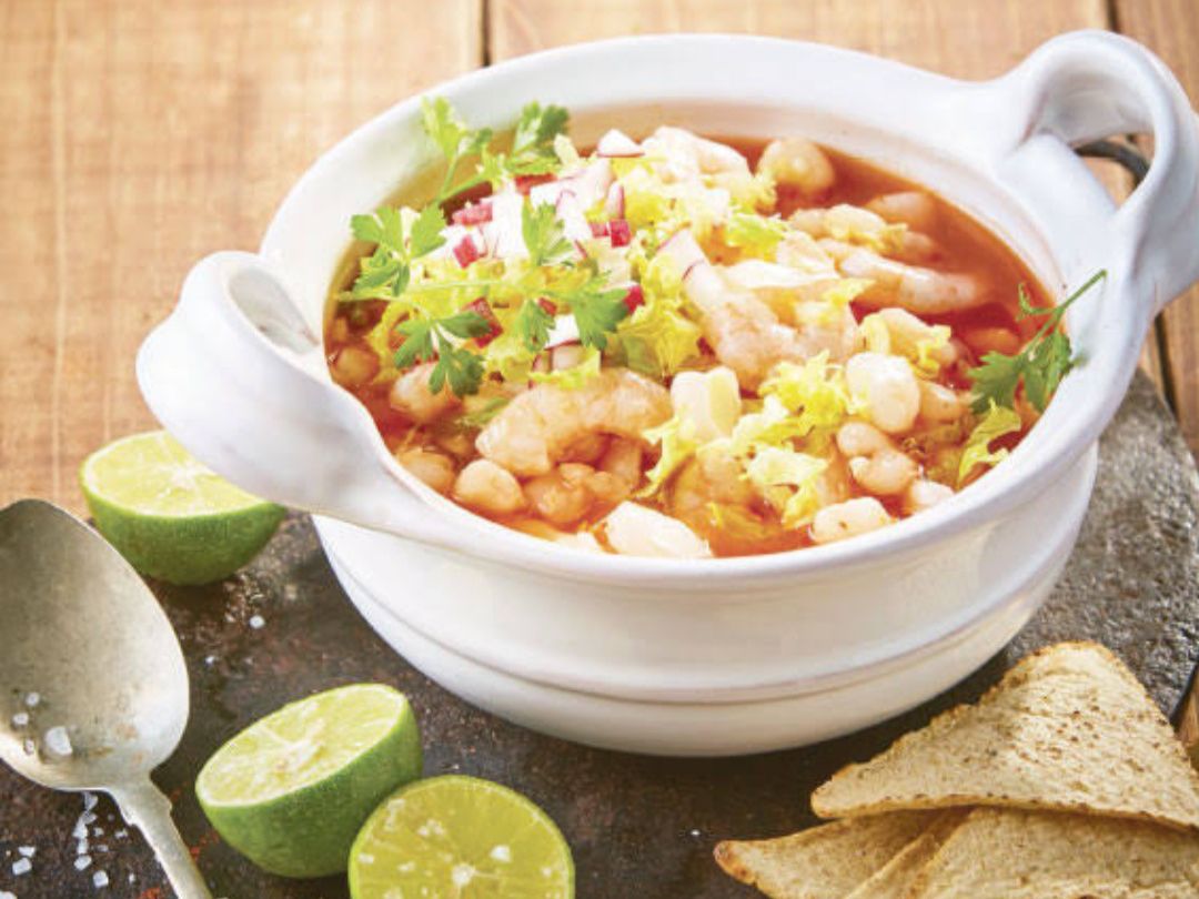 Delicioso Pozol de Camaron acompañado de lechuga, rabano, limon, oregano, chile piquin, y crujientes totopos