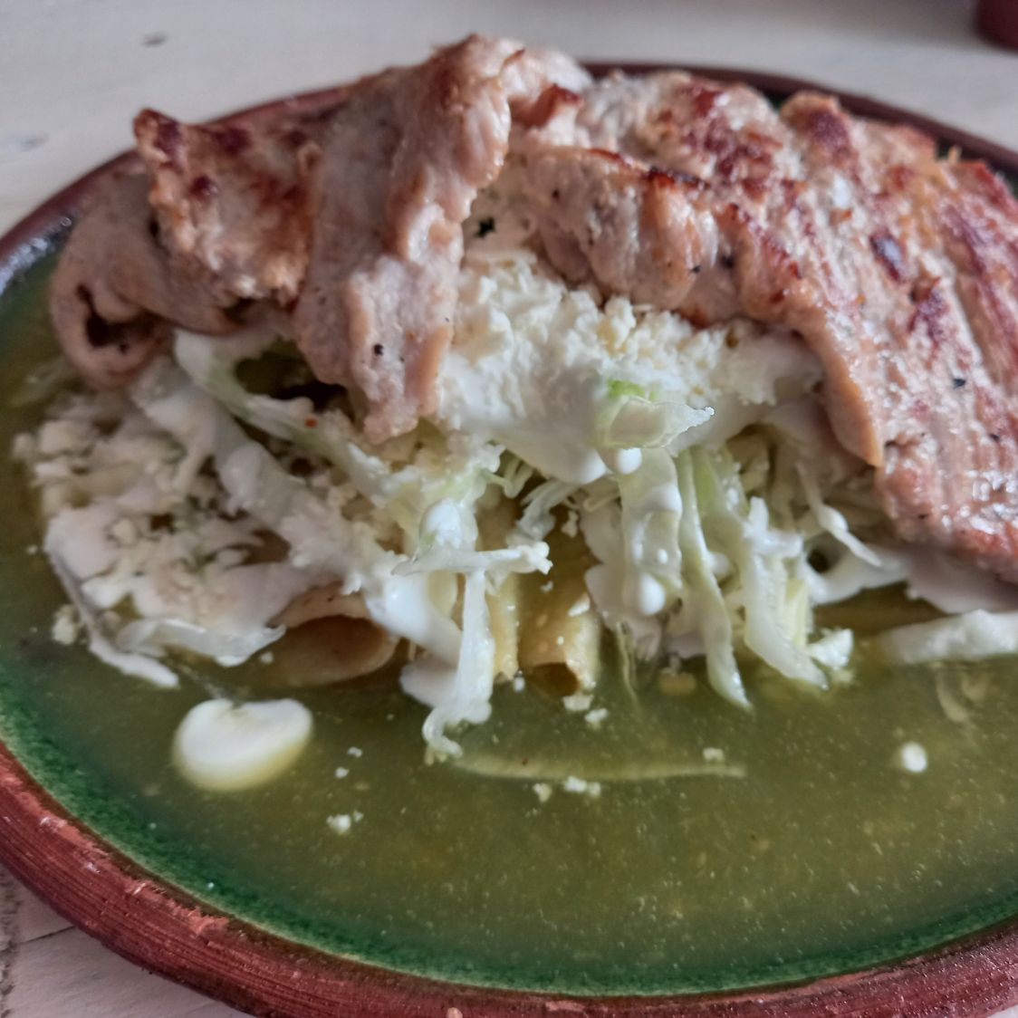 chilaquiles bañados en salsa suiza con pollo deshebrado, crema, queso, cebolla y cilantro picados