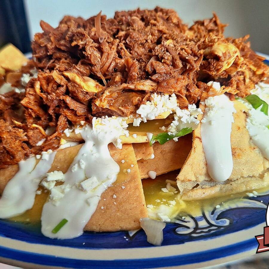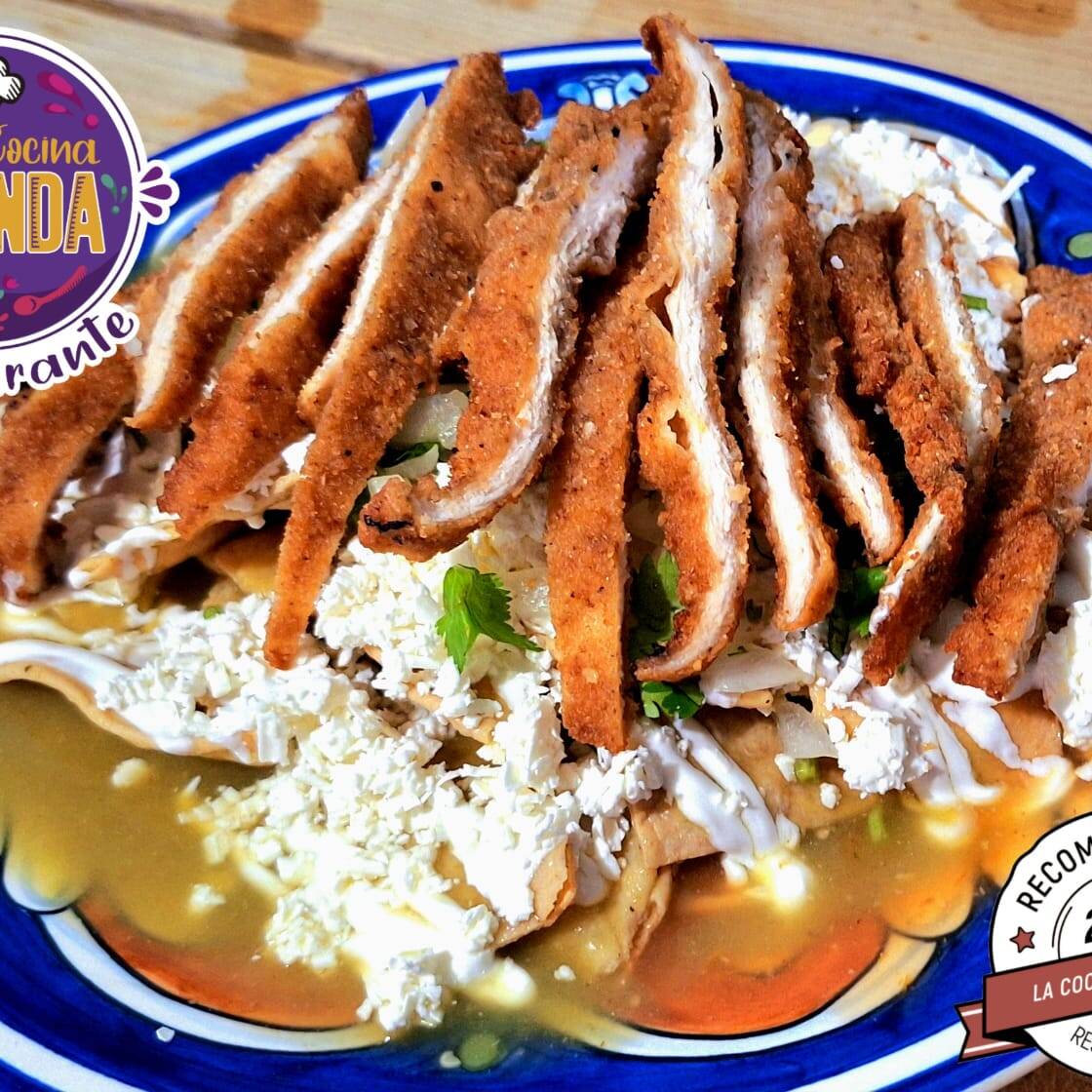Crujientes totopos bañados en la salsa de tu eleccion, con crema, queso cotija, cebolla y cilantro picados.