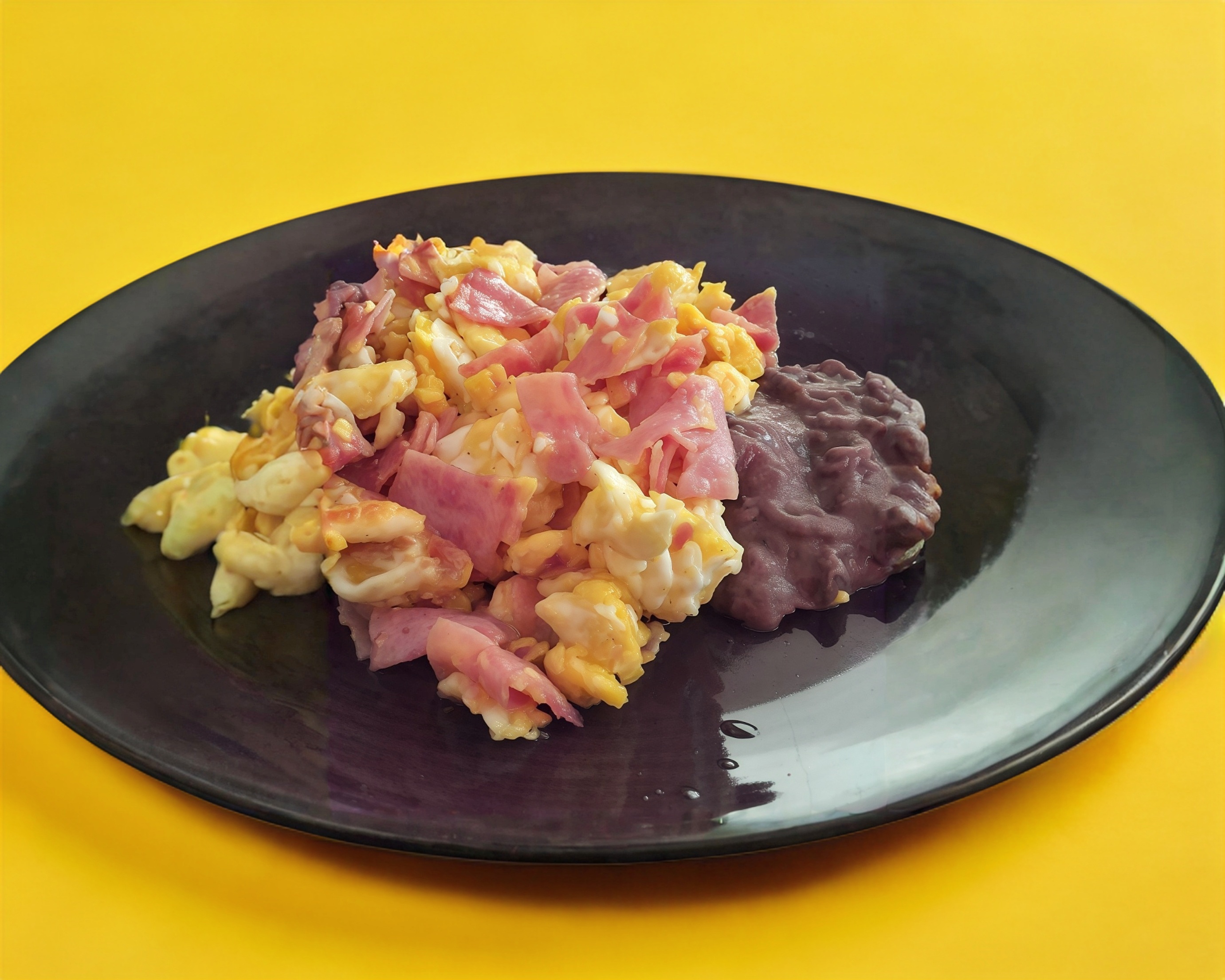 2 Huevos revueltos con jamon acompañados con frijoles y salsa + un bolillo