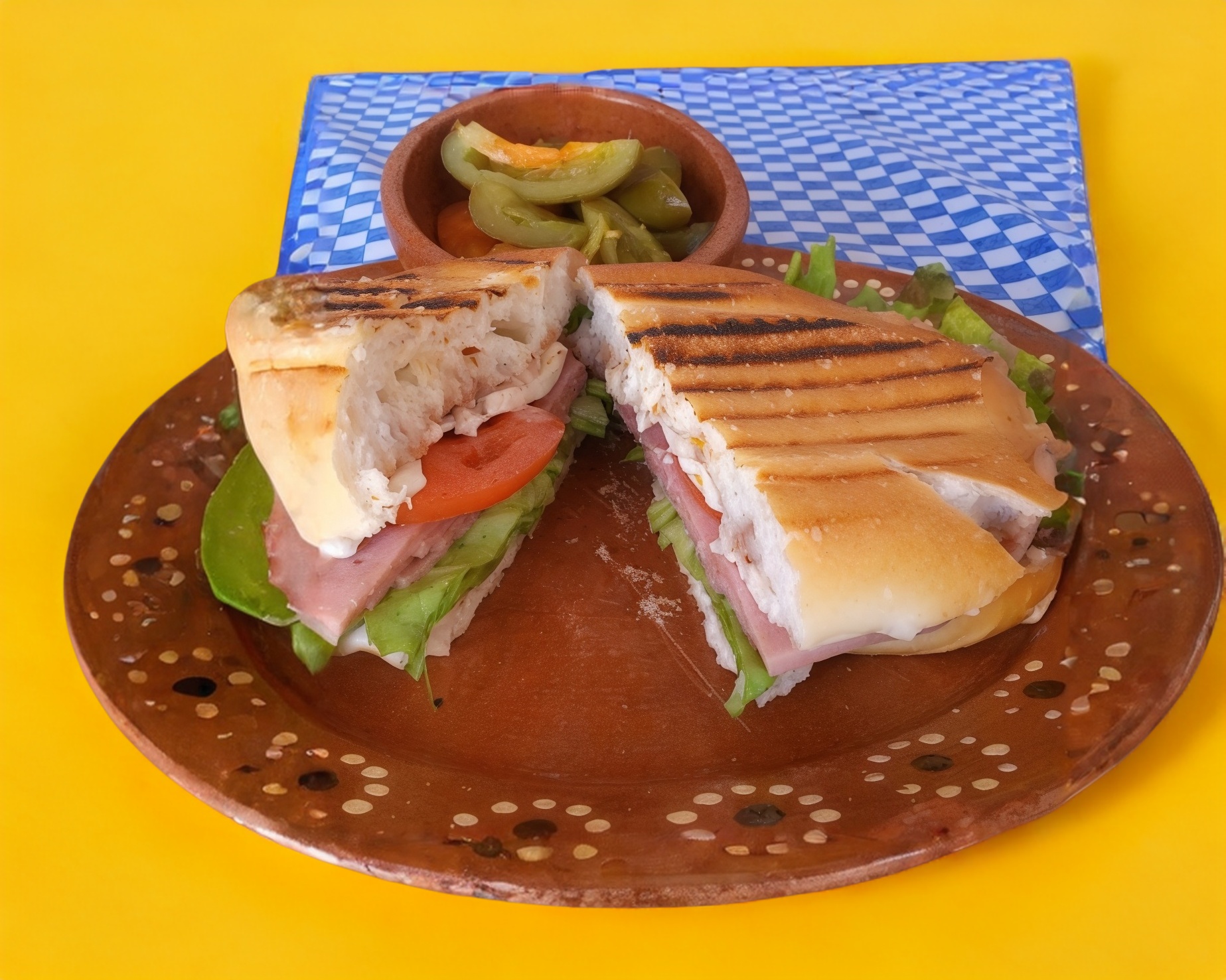 Pan telera con aderezo especial de la casa, jamón de pavo, queso panela, frijoles, lechuga, jitomate y chiles jalapeño.