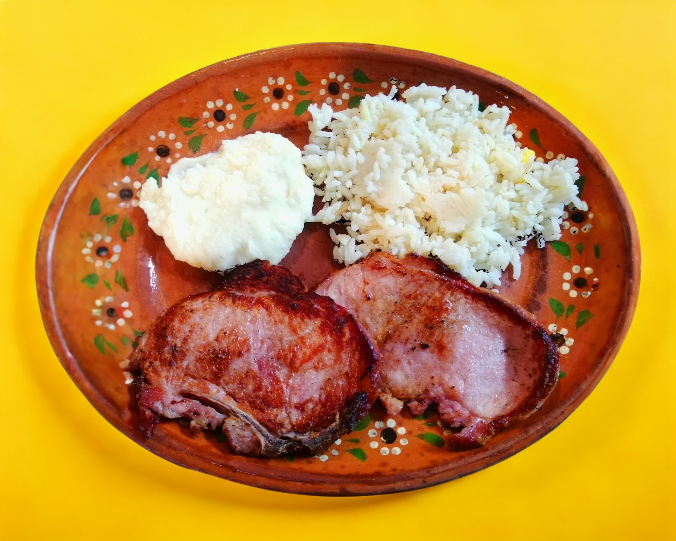 son de puerco acompañadas con arroz y ensalada de luchuga,pepino y jitomate con sopa