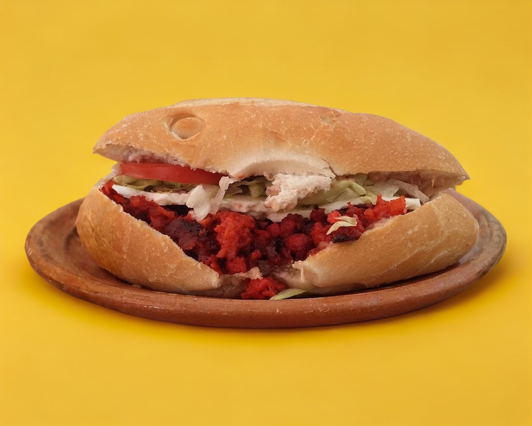 Pan telera, con aderezo especial de la casa, frijoles, lechuga, jitomate, chorizo toluqueño, queso panela y chiles jalapeños.
