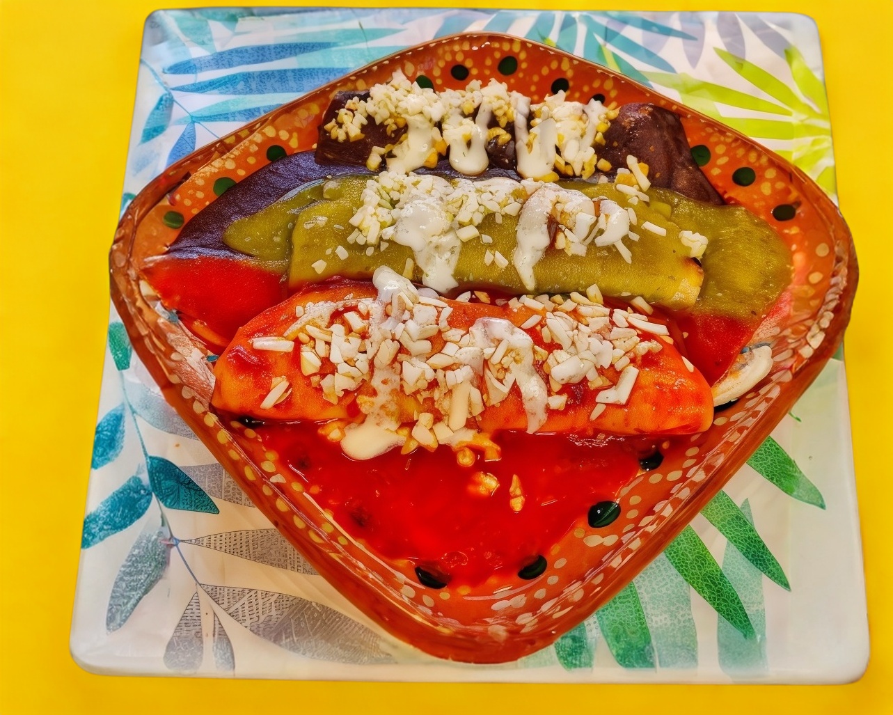 3 piezas de Enchiladas. Una Roja Una Verde Una de Mole