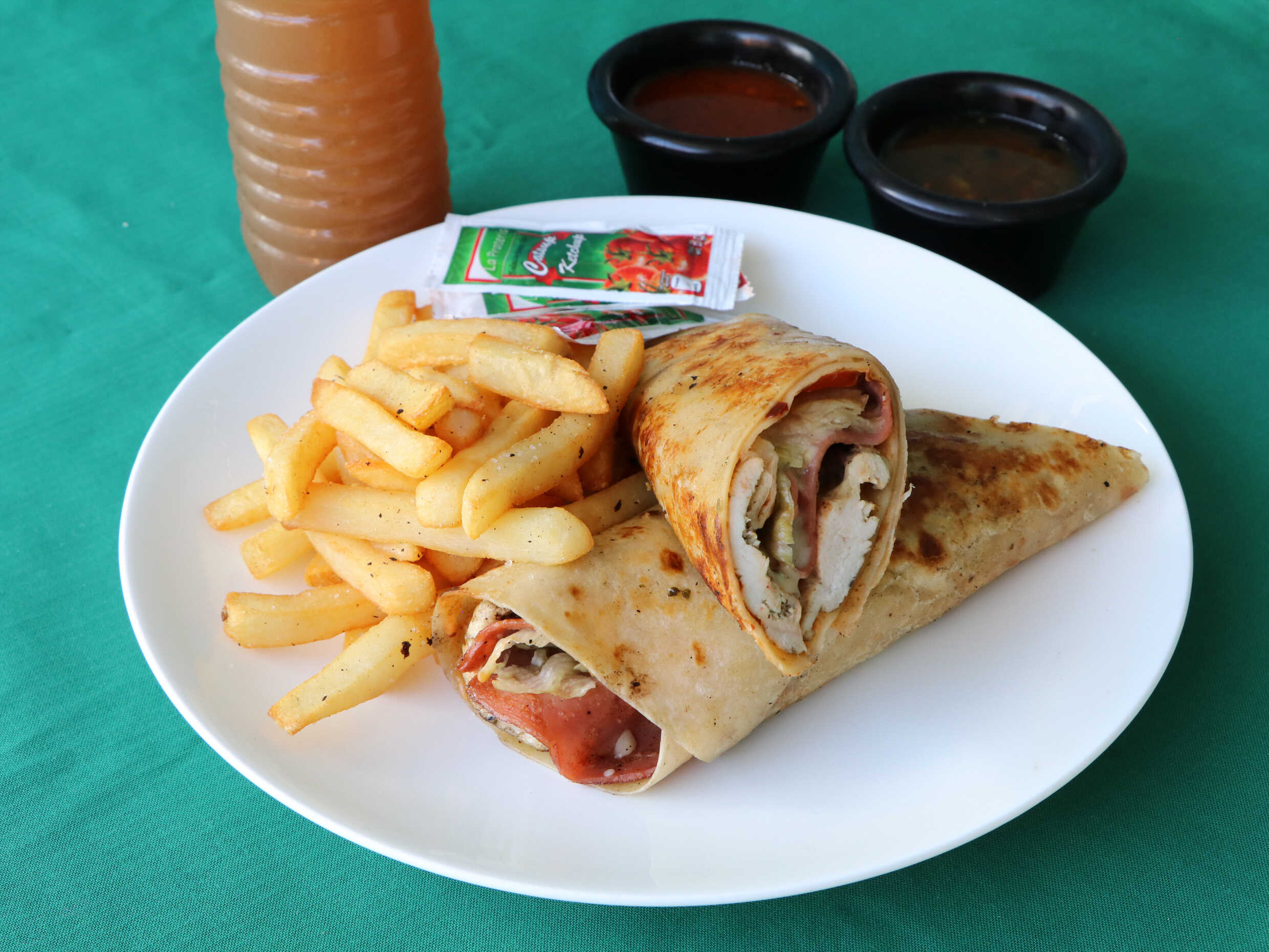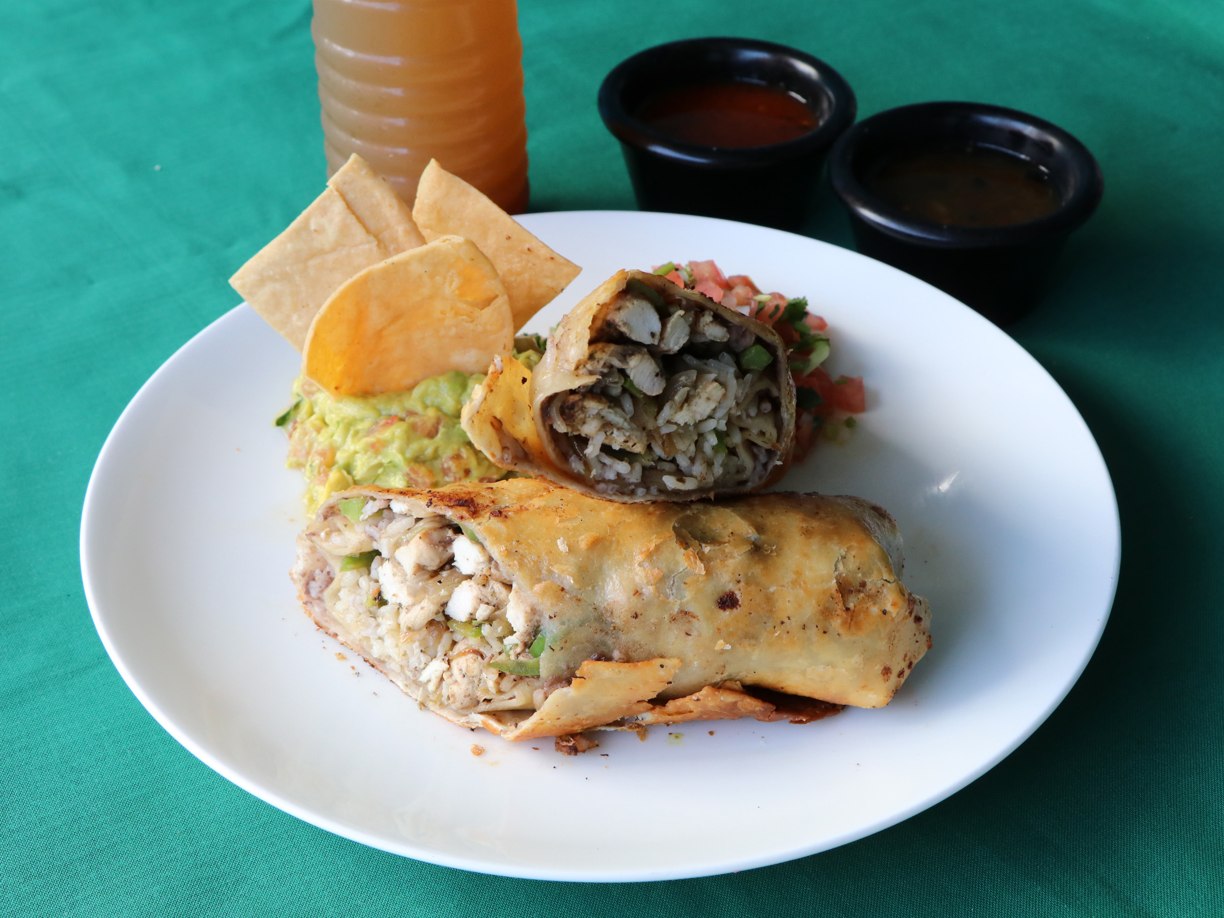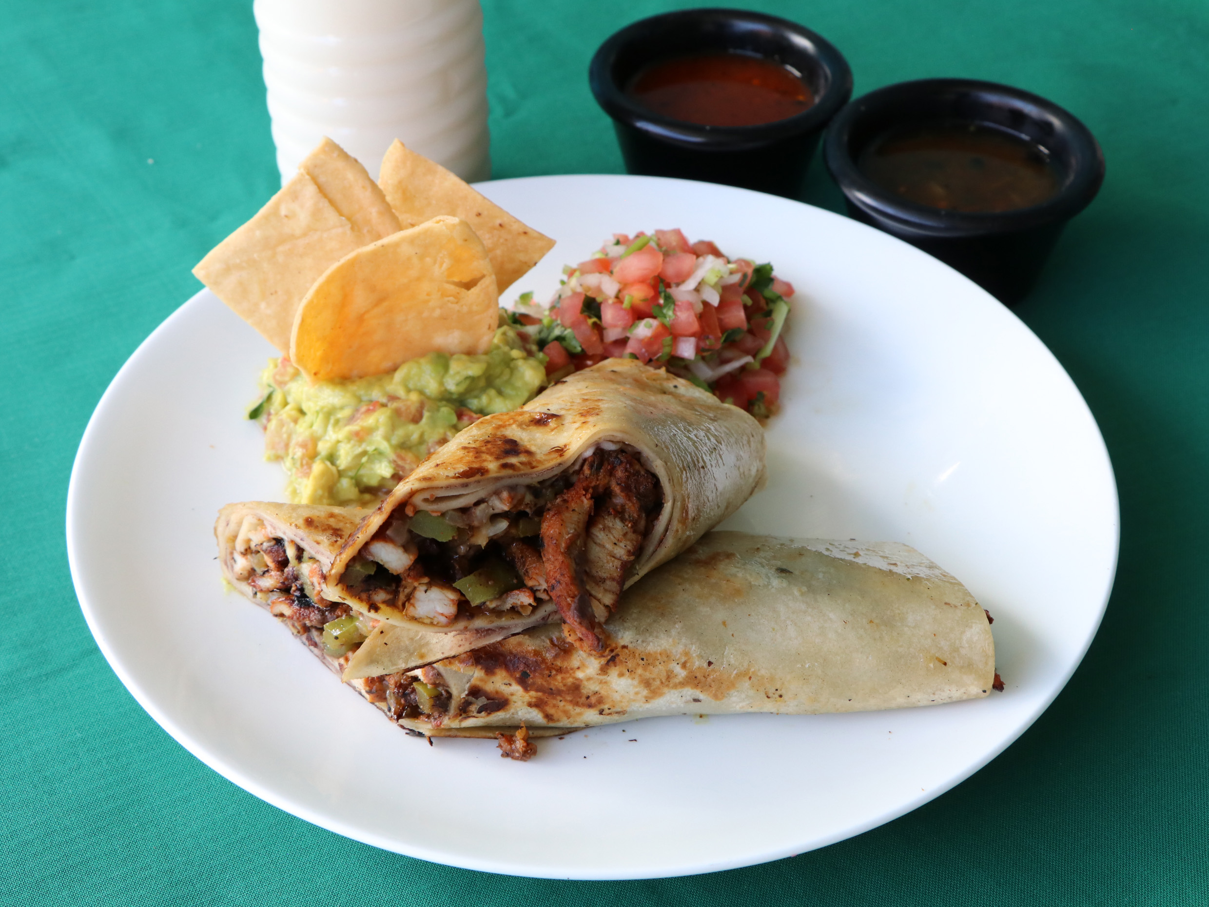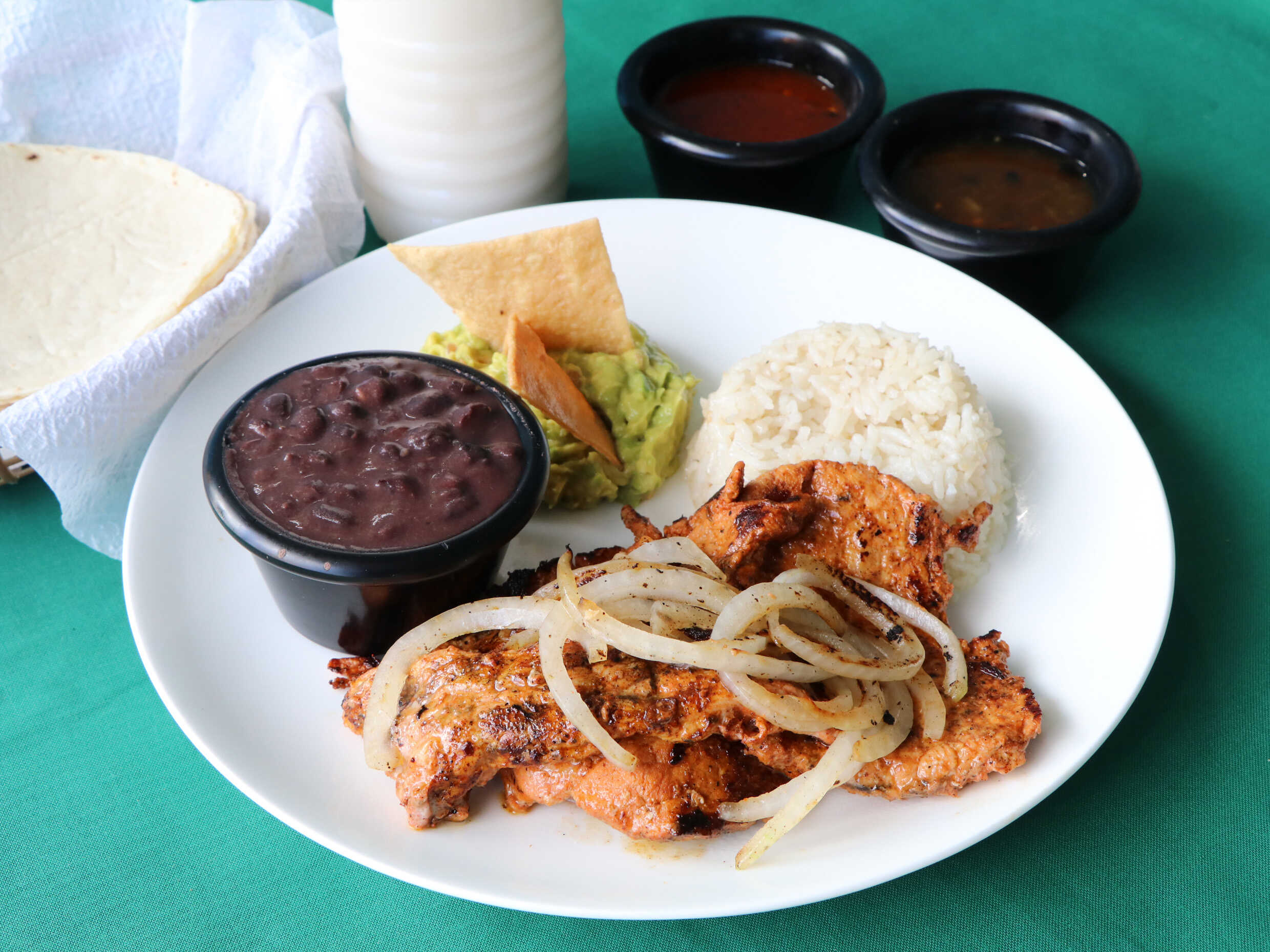 Pechuga de pollo con pimiento, cebolla, frijoles, arroz y queso en tortillas de 26 cm con guacamole, pico de gallo y agua.