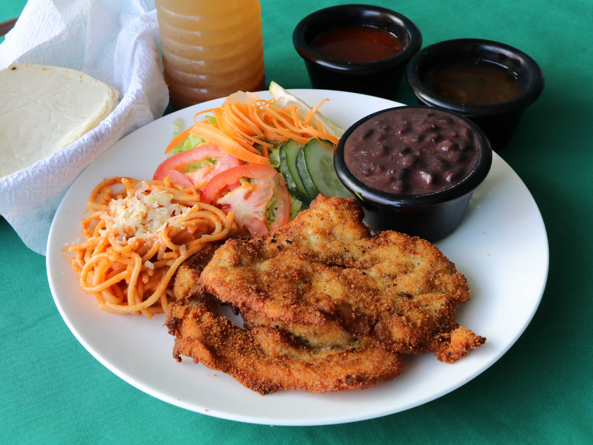 Aprox. 190 gr ,pechuga empanizada ,Con pasta frijol ensalada (lechuga ,tomate ,peino ,zanahoria y limón ) y agua del día 500 ml