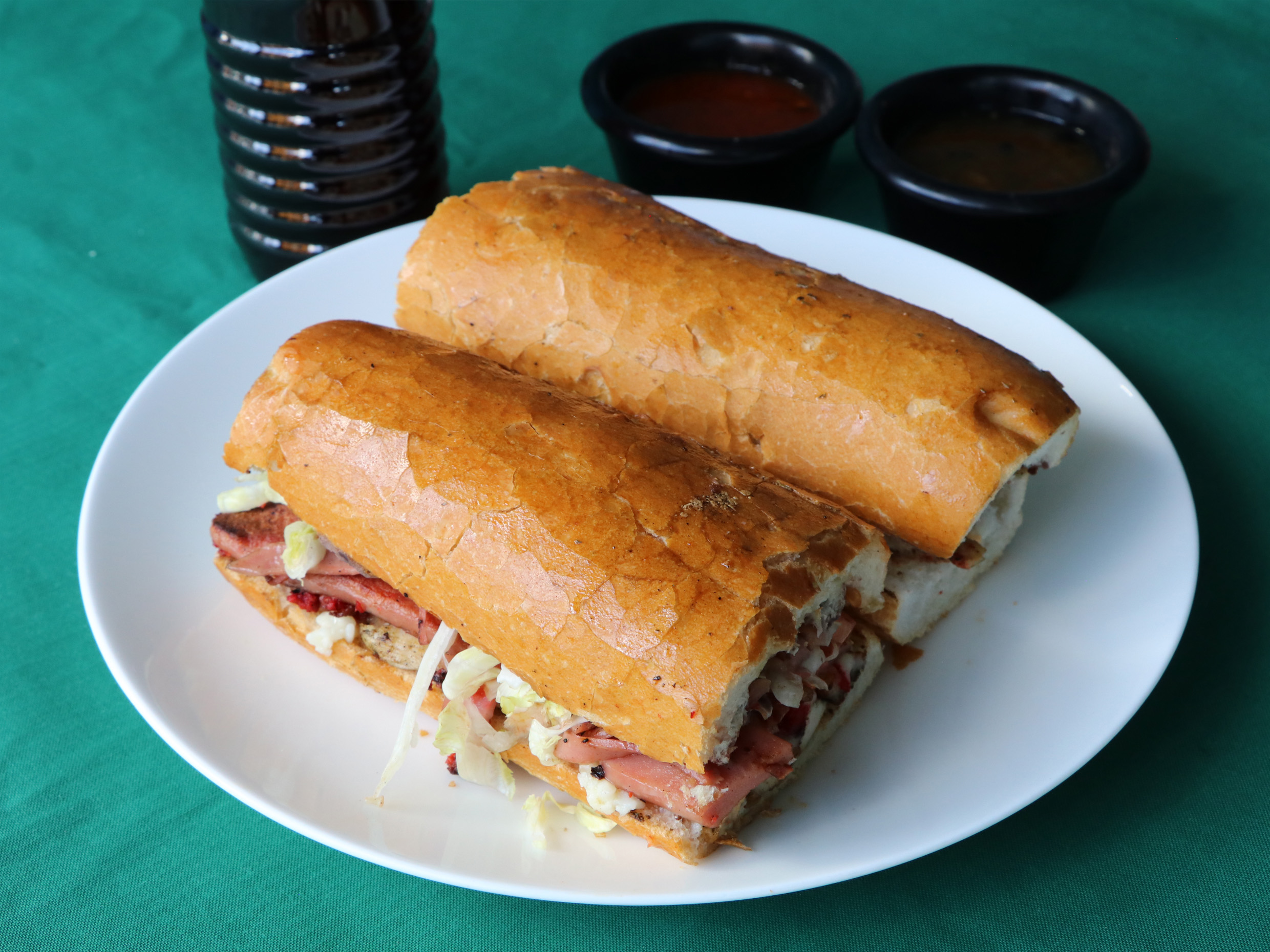 Carne asada, pechuga de pollo, col, jamón, queso, salchicha, chorizo, frijol, mayonesa en baguette de 30 cm.