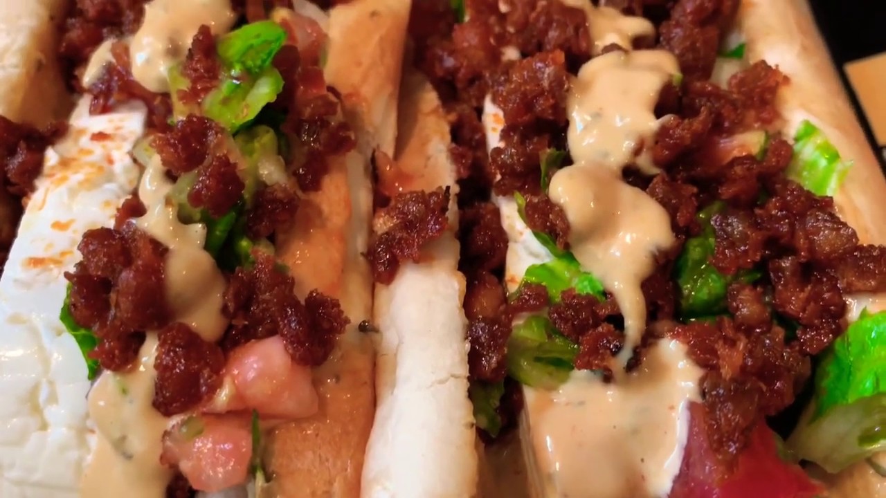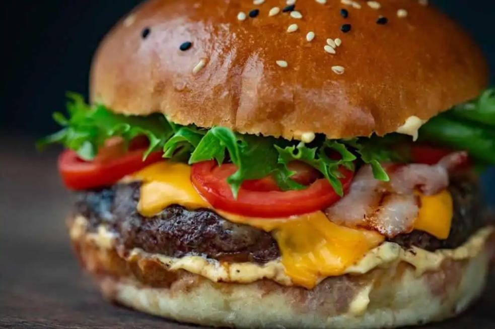 Pan artesanal,carne,queso,jamón,tocino,verduras,mayonesa,catsup..
