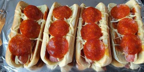 2 hotdogs clásicos con champiñones gratinados en queso mozzarella acompañado de papas fritas