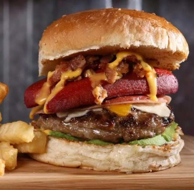 Doble carne ,jamón,queso,tocino,aderezos,verduras.