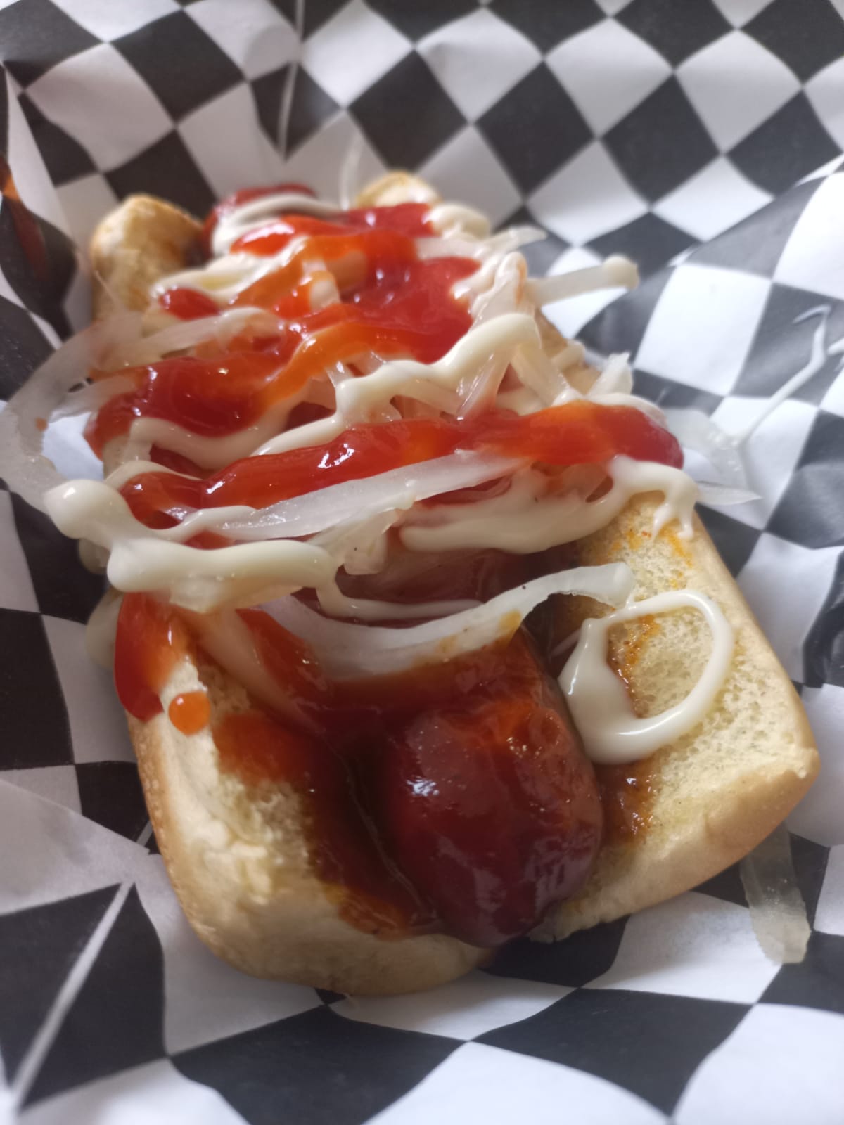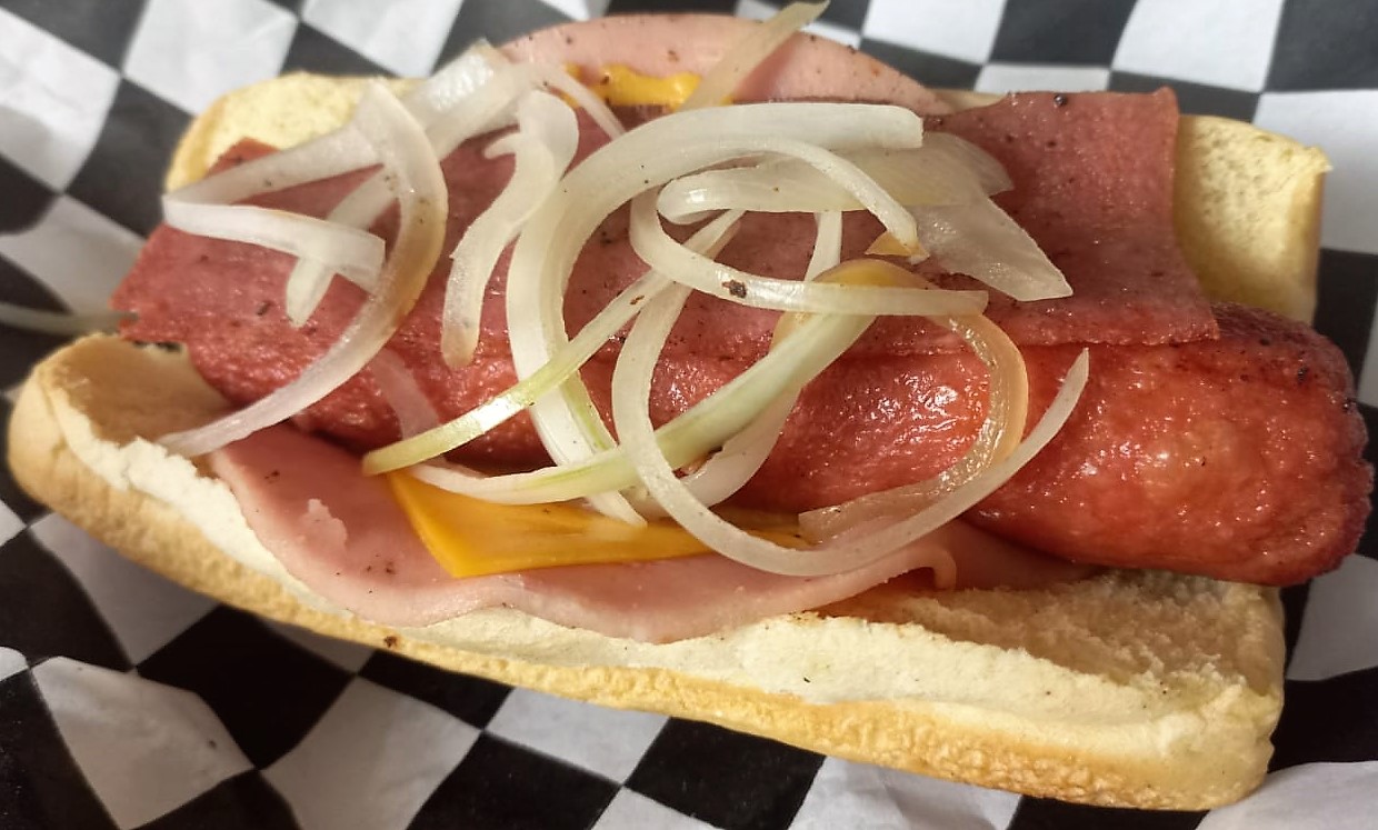 Salchicha, jamón, queso,tocineta,capsup y mayonesa.